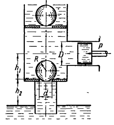 Определить силу, прижимающую стальной (относительный вес б = 8) шаровой всасывающий клапан радиусом R=100мм к седлу, имеющему дчаметр d= 125 мм, если диаметр насосного цилиндра D = 350 мм, а усилие по штоку P = 400кГ. Седло клапана расположено ниже оси цилиндра на расстоянии h1 = 0,5 м и выше свободной поверхности резервуара с атмосферным давлением на расстоянии h2 = 6,5 м, причем труба под клапаном заполнена водой.