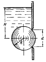 Каков наименьший уровень Н воды в сосуде, при котором стальной шар (б = 8) радиусом R=100мм, перекрывающий круглое отверстие диаметром d=1,5R в вертикальной стенке, будет находиться в равновесии?