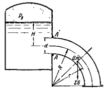 Определить отрывающее Ропр и сдвигающее Рсдв усилия и изгибающий момент М на фланце А, крепящем колено 90° к баку, если разрежение воздуха в баке Pв = 10кПа и глубина H= 1,8 м. Диаметр колена d = 400 мм., его радиус кривизны R= 1 м и масса m = 100 кг. Центр тяжести колена, заполненного водой, принять расположенным на биссектрисе в точке r =0,9·R = 0,9·1=0,9м. Как влияет величина давления воздуха в сосуде на искомые усилия и момент?