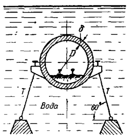 Подводный железобетонный туннель круглого сечения с внутренним диаметром D = 3м и толщиной стенки б = 250 мм удерживается от всплывания тросами Т, расположенными попарно через каждые 6 м длины туннеля. Определить натяжение тросов, принимая, что дополнительная нагрузка, приходящаяся на 1 м длины туннеля, G=10 кН, а плотность бетона 2,5 т/м3.