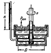 Вал жидкостного тахометра вращает диск, который увлекает во вращательное движение масло, находящееся в нижней полости корпуса прибора, куда оно поступает из верхней полости через радиальные отверстия полого вала. Создающееся в нижней полости повышенное за счет вращения давление измеряется пьезометром. Определить высоту Н шкалы пьезометра, необходимую для измерения числа оборотов вала тахометра n = 300 об/мин, если диаметр диска D = 0,2 м. Влиянием зазора между диском и корпусом прибора пренебречь.