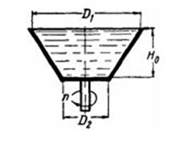 Определить наименьшее число оборотов, при которой полностью опорожнится предварительно заполненный жидкостью открытый конический сосуд, имеющий диаметры D1 = 460 мм; D2 = 200 мм и высоту H0 = 75 мм.