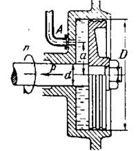В гидравлическую пяту, вращающуюся с частотой n = 3000 об/мин, по трубке А под давлением р = 1 МПа подается вода. Определить осевую силу Р, которую может уравновешивать пята, считая, что вода под поршнем вращается с половиной угловой скорости вращения последнего. Диаметр поршня D = 0,32 м, диаметр вала d = 0,05 м, трубка присоединена к корпусу пяты на расстоянии а = 0,07 м от оси. На каком расстоянии от оси нужно расположить трубку А, чтобы осевая сила, уравновешиваемая пятой, не зависела от оборотов?