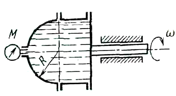 Определить силу давления воды па полусферическую крышку цилиндрического сосуда радиусом R = 0,2 м, если сосуд вращается относительно своей оси с угловой скоростью w= 100 рад/с и манометр при этом показывает давление М = 50кПа. Действием силы тяжести на жидкость пренебречь.