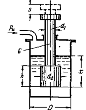 Ступенчатый шток с размерами d1= 100 мм, d2=h=300 мм и весом G = 24 кГ плавает в воде, заполняющей цилиндрический сосуд диаметром D = 400 мм. В пространстве над водой может быть установлено любое заданное давление воздуха. 1) Определить глубину погружения x штока при атмосферном давлении над уровнем воды. 2) Определить, при каком избыточном давлении ри шток выйдет из воды и каково будет при этом его перемещение S от начального положения при ри = 0? Построить график зависимости S=f(ри).