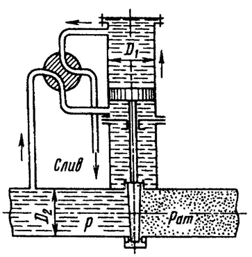 Определить диаметр D1 гидравлического цилиндра, необходимый для подъема задвижки при избыточном давлении жидкости р = 1 МПа, если диаметр трубопровода D2 = 1 м и масса подвижных частей устройства m = 204 кг. При расчете коэффициент трения задвижки в направляющих поверхностях принять f = 0,3, силу трения в цилиндре считать равной 5% от веса подвижных частей. Давление за задвижкой равно атмосферному, влиянием площади штока пренебречь
