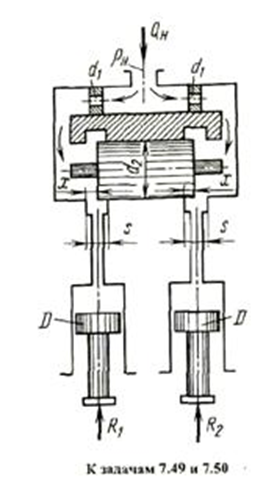 Для синхронизации работы гидроцилиндров использовал делитель расхода (порционер), в котором две ветви потока проходят через дроссельные шайбы диаметром d1 = 2 мм и цилиндрические золотниковые окна высотой s = 2 мм, перекрываемые плавающим поршеньком диаметром d2 = 10 мм. При неодинаковых нагрузках гидроцилиндров поршенек смещается в сторону менее нагруженной ветви, изменяя сопротивления ветвей (за счет неодинаковых открытий золотниковых окон) и поддерживая равенство расходов, поступающих в гидроцилиндры. Определить скорость vn установившегося движения поршней гидроцилиндров, давление Pи насоса на входе в делитель и смещение x поршенька из крайнего левого положения при нагрузках гидроцилиндров R1 = 20000 Н и R2 = 15000 Н. Коэффициент расхода дроссельных шайб принять µ1 = 0,6 и Золотниковых окон µ2 = 0.5. Потерями напора в трубах, трением и утечками в гидроцилиндрах пренебречь.