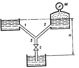 Определить коэффициент сопротивления ξ, вентиля, при котором расход воды в трубе 3 будет Q3=9 л/с, если трубы 1, 2 и 3 имеют одинаковые длины L1=L2=L3= 9м и диаметры d1=d2=d3= 50 мм (л = 0,025), высота уровней в резервуарах h= 15 м и избыточное давление М = 15 кПа. Учитывать только потери напора на трение по длине труб и потерю напора в вентиле.