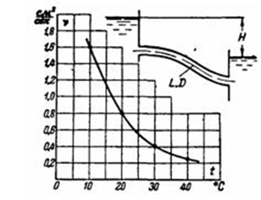 Выяснить влияние подогрева нефти на пропускную способность самотечного стального трубопровода длиной L = 10 км и диаметром D = 200 мм (шероховатость 0,2 мм), работающего под постоянным напором H = 45 м, определив расход нефти при четырех значениях ее температуры t = 10, 20, 30 и 40° С. Воспользоваться приведенным графиком зависимости вязкости нефти v от температуры.