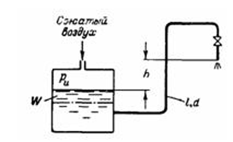 Купоросное масло при t = 25°С (μ = 20 сП, δ =1,84) выжимается из бака в атмосферу давлением воздуха Рн = 0,3 МПа по трубе длиной l = 40 м, поднимаясь на h = 8 м. Определить диаметр трубопровода, при котором объем масла W = 3,0 м3 будет выжиматься из бака за Т = 5 мин, если шероховатость трубы Δ = 0,05 мм и местные потери составляют 25% потерь на трение (изменением h в процессе выжимания масла пренебрегать).