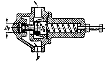 Определить предварительное поджатие х пружины, нагружающей дифференциальный предохранительный клапан, необходимое для того, чтобы клапан открывался при давлении P=30 кГ/см2. Диаметры поршней: D1 = 22 мм; D2 = 20 мм, а жесткость пружины С = 0,8 кГ/мм.