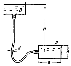 Призматический бак А со стороной квадратного основания а = 2 м и высотой Н =1,6 м заполняется бензином из центрального бензохранилища В, уровень в котором постоянен (Н = 5 м). Заполнение происходит через гибкий шланг длиной l = 7 м, выходное сечение которого находится на середине высоты бака. Определить диаметр шланга d, при котором бак будет заполняться в заданное время Т = 15 мин, приняв коэффициент сопротивления трения в шланге равным 0,05; местными потерями в шланге пренебречь.