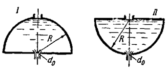 Сравнить время опорожнения полушарового сосуда, расположенного сферой вверх (I) со временем опорожнения полушарового сосуда того же радиуса R, располюженного сферой вниз (II). В обоих случаях истечение происходит через одинаковое отверстие d0. Давление на свободной поверхности жидкости при истечении считать атмосферным.