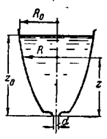 2) Диаметр d насадка, при котором постоянная скорость опускания уровня при опорожнении сосуда такой формы будет равняться v=1 мм/сек, если начальные значения радиуса и заполнения сосуда равны R0~125мм и z0 = 310 мм. Коэффициент расхода насадка принимать постоянным и равным 0,95.