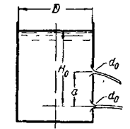 Определить время опорожнения цилиндрического резервуара, диаметр которого D = 0,8 м, через два круглых отверстия каждое диаметром d0 = 10 мм, расположенные на расстоянии а = 0,5 м по высоте друг от друга. Начальное положение уровня H0 = 1,5 м. Коэффициент расхода каждого из отверстий 0,62.