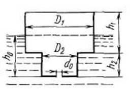 Определить время затопления тонкостенного сосуда после открытия донного отверстия диаметром d0 = 25 мм. Сосуд имеет два цилиндрических участка, диаметры которых D1 = 1,2 м и D2 = 0,6 м, а высоты h1 = 0,8 м и h2 = 0,5 м. Начальное погружение сосуда h0 = 0,85 м. Коэффициент расхода отверстия принять 0,6.