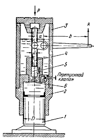 Гидравлический домкрат состоит из неподвижного поршня 1 и скользящего но нему цилиндра 2, на котором смонтированы корпус 3 (образующий масляную ванну домкрата) и плунжерный насос 4 ручного привода со всасывающим 5 и нагнетательным 6 клапанами.