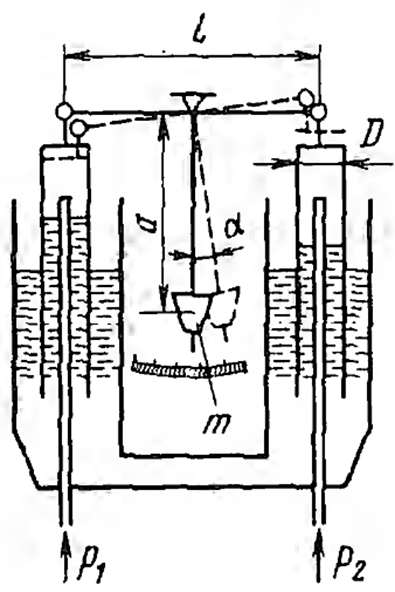Для измерения малых перепадов давления (ΔP = P1-P2) применяется колокольный манометр, состоящий из двух тонкостенных колоколов диаметрами D=100 мм, подвешенных на концах коромысла длиной l = 260 мм. В центре коромысло имеет опорную призму и снабжено стержнем длиной а = 400 мм с грузом G на конце. Нижними концами цилиндры погружены в жидкость. Измеряемые давления подводятся во внутренние полости цилиндров. При равенстве давлений стержень занимает отвесное положение. Под действием перепада цилиндры перемещаются и стержень отклоняется. Подобрать вес груза G таким образом, чтобы перепад величиной ΔP = 1 кПа отклонял стержень не более чем на 10°.