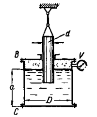 Цилиндрический сосуд, имеющий диаметр D= 0,4 м и наполненный водой до высоты а=0,3 м, висит без трения на плунжере диаметром d = 0,2 м. Определить: 1) Вакуум V, обеспечивающий равновесие сосуда, если его собственный вес G=50 кГ. Как влияют на полученный результат величина диаметра плунжера и глубина его погружения в жидкость? 2) Силы давления, действующие на крышки В и С сосуда. См. указание к задаче 1-16.