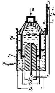 Для измерения малых сил используется жидкостный динамометр, состоящий из цилиндра А, наполненного до некоторого уровня ртутью, и погруженного в ртуть тонкостенного поршня В. Пространство под поршнем заполнено спиртом (б = 0,8) и соединено со стеклянной трубкой пьезометра. Нагружение поршня силой Р сопровождается увеличением давления под ним и подъемом уровня спирта в пьезометре, характеризующим величину измеряемой силы.
