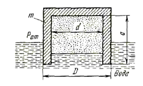 Определить, какое избыточное давление воздуха установится в плавающем толстостенном колоколе диаметрами D=1 м и d = 0,6 м, высотой а =1,4 м и массой m=1020 кг при давлении атмосферного воздуха, равном Рат= 100 кПа. Процесс сжатия воздуха в колоколе считать изотермическим.