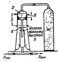 Зарядка пневматического аккумулятора (повышение давления воздуха в нем) производится при перемещении в цилиндре аккумулятора поршня из нижнего его положения в верхнее. Перемещение поршня осуществляется силой, действующей на торец штока поршня со стороны воды, нагнетаемой под шток насосом аккумулятора. Определить: 1) Давление воздуха при верхнем и нижнем положениях поршня, если пневматический аккумулятор имеет размеры по эскизу: диаметры d = 135 мм. и D = 600 мм; ход S= 1400 мм; манжеты b = 20 мм. и В = 25 мм; W=1,5 м3. Максимальное давление, развиваемое насосами при зарядке аккумулятора, Pнас = 300 кГ/см2. Коэффициент трения в манжетах f = 0,1. 2) Максимальное и минимальное давления воды, развиваемые аккумулятором + (Pакк). При расчетах полагать движение поршня равномерным и процесс сжатия воздуха в .аккумуляторе изотермическим.