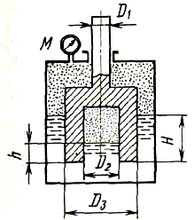 Определить массу т колокола, имеющего диаметры D1 =0,1 м, D2 = 0,2 м. D3 = 0,4 м, если глубина его погружения в волу при плавании в закрытом сосуде Н = 0,3 м, подъел уровня воды внутри колокола h = 0.1 м, а избыточное давление на поверхности воды вне колокола М = 20 кПа.