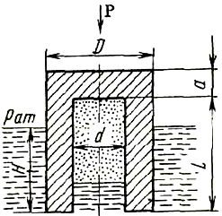 Определить массу т толстостенного колокола размерами D = 0,4 м, и d = 0,2 м, L = 1 м, а = 0,1 м, если он плавает в воде при погружении Н = 0,6 м. При какой добавочной нагрузке Р колокол целиком погрузится в воду? При решении задачи давление воздуха в колоколе перед погружением считать равным атмосферному (Pат = 98 кПа), а процесс сжатая воздуха при погружении - изотермическим.