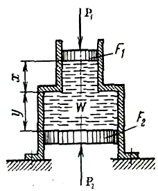 Неподвижный сосуд, составленный из двух цилиндров, заполнен жидкостью, удерживаемой поршнями, на которые действуют силы Р1 и P2. Определить положения х и у поршней относительно торцевой стенки сосуда, при которых система находится в равновесии. Площади поршней равны F1, и F2, объем жидкости между ними равен W, При решении задачи трением поршней о стенки сосуда пренебречь.