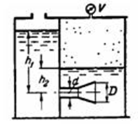 Бензин (δ = 0,75) перетекает из открытого левого бака в закрытый правый бак. Уровни в баках и вакуум в правом баке поддерживаются постоянными и равными h1 = 7 м, h2 = 3 м, V= 30 кПа. Определить расходы бензина через цилиндрический насадок диаметром d = 60 мм и через составной насадок, полученный путем добавления к цилиндрическому насадку конического диффузора с выходным диаметром D = 80 мм и коэффициентом потерь φД = 0,3.