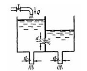 Определить расход через левый (Qл) и правый (Qп) насадоки при установившемся режиме, предполагая, что отверстие в перегородке является затопленным. Как надо изменить диаметр насадка в левой секции, чтобы расходы через оба насадка стали равными?