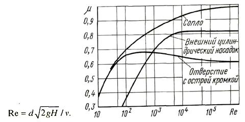 Сравнить расходы жидкости через отверстие с острой кромкой, внешний цилиндрически» насадок и коноидальный насадок (сопло) одинакового диаметра H = 10 мм при одинаковом напоре истечения H = 5 м и двух значениях кинематической вязкости жидкости v = 1 и 1000 сСт. Воспользоваться приведенными кривыми зависимости коэффициента расхода отверстия, насадка и сопла от числа Рейнольдса
