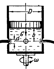 Из сосуда диаметром D = 0,6 м, который вращается вокруг вертикальной оси с угловой скоростью w=10 1/сек и закрыт сверху поршнем весом G = 282 кГ, вытекает вода через четыре боковых отверстия (d =10 мм; м = 0,6). Определить, в течение какого времени будет продолжаться истечение, если в начальный момент отверстия расположены на глубине b=0,3 м под поршнем. Трением поршня пренебрегать.