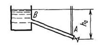 На конце трубы мгновенно открывается кран А. Найти минимальное давление перед ним, если коэффициент расхода открытого крана 0,6, скорость ударной волны а = 1000 м/с, статический напор перед закрытым краном h0= 100 м. Исследовать закон изменения расхода через кран. Трением в трубе пренебречь.