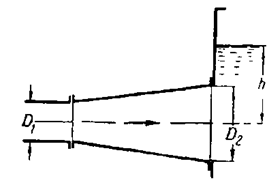 Из диффузора, входной и выходной диаметры которого D1 = 0,25 м и D2 = 0,5 м вода поступает в бак с постоянным уровнем h = 4 м в объёме 0,4 м3/с.
