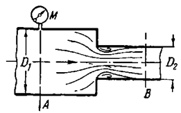 Определить осевую силу, приложенную к трубопроводу на участке АВ внезапного сужения от D1 = 300 мм до D2= 200 мм. Показание манометра перед сужением M= 1,5 атм, расход воды Q = 0,28 м3/сек. Сопротивление участка определить по формуле (7-5) введения гл. 7.