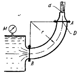 Определить гидравлические нагрузки болтовых групп во фланцевых соединениях A и B при истечении воды из бака через отвод и присоединенный к нему насадок. Выходной диаметр насадка d = 50 мм, диаметр отвода D = 100 мм и его радиус кривизны r = 400 мм. Избыточное давление в баке M = 1 МПа. Гидравлическими сопротивлениями и весом жидкости в отводе пренебречь.