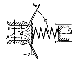 Предохранительный клапан с диаметром седла d= 25 мм пропускает при избыточном давлении в седле P=3,2 МПа расход масла (плотность р = 920 кг/м3), равный Q=10 л/сек; при этом открытие клапана S = 5 мм. Пренебрегая потерями напора в клапанной щели, определить направление вытекающей из клапана струи (угол а), если известно, что начальное давление открытия клапана равно P0 = 2,85 МПа, и жесткость его пружины С = 20 Н/м.