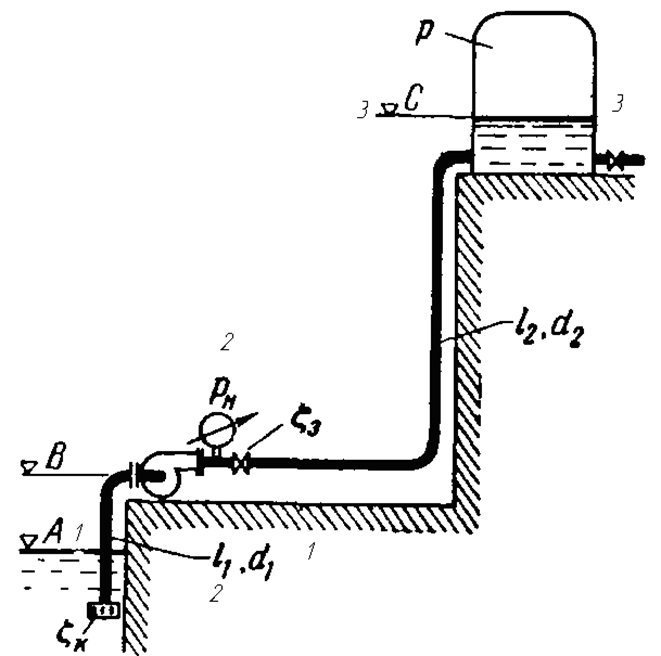 Центробежный насос, расположенный на уровне с отметкой B = 4 м, перекачивает воду из открытого резервуара с уровнем A = 2 м в резервуар с уровнем C = 14 м и давлением на поверхности P = 1,2 атм. Определить подачу, напор и мощность насоса, если манометр, установленный на выходе из насоса, показывает рМ = 2,5 атм, а всасывающий и нагнетательный трубопроводы имеют длины l1 = 6 м и l2=60 м и диаметры d1 = 100 мм и d2 = 80 мм. При расчетах принять коэффициенты сопротивления трения трубопроводов равными 1 =0,025 и 2 = 0,028, коэффициенты сопротивлений всасывающей коробки с обратным клапаном к=7 и частично закрытой задвижкой 3 =8. Построить пьезометрическую линию для системы.