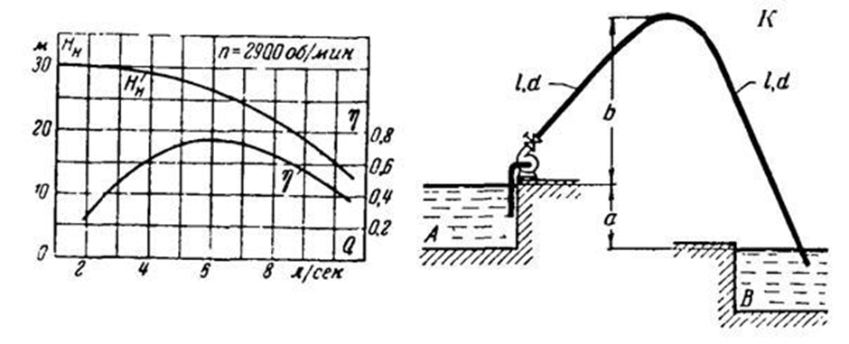 При помощи центробежного насоса, характеристика которого задана при n = 2900 об/мин, необходимо перекачивать воду по сифонному трубопроводу с одинаковыми восходящей и нисходящей ветвями, каждая длиной l = 10 м и диаметром d = 40 мм (λ = 0,03). Разность уровней в баках а = 2 м, верхняя точка К. сифона расположена на высоте b =8 м. Определить наименьшую частоту вращения насоса, при которой в точке К не будет вакуума. Местными потерями напора в насосе пренебречь.