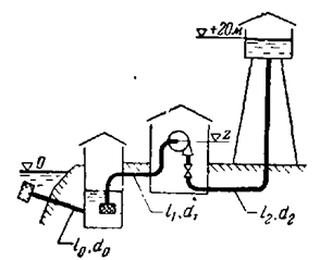1. Найти число оборотов насоса и мощность Nдв, если его подача в башню Qн = 60 л/с. Приведенные длины труб l0 = 10 м; l1 = 10 м; l2 = 100 м; диаметры d0 = 0,2 м, d1 = 0,2 м; d3 = 0,15 м (λ = 0,03).