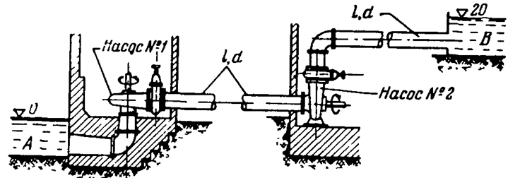 Два последовательно соединенных одинаковых центробежных насоса перекачивают воду при числах оборотов n1 = n2=1000 об/мин из водохранилища А с отметкой уровня 0 в бассейн В с отметкой уровня 20 по трубопроводу, состоящему из двух одинаковых участков длиной l=1 км и диаметром d= 250 мм каждый ( = 0,02). Пренебрегая местными потерями, определить подачу насосов и потребляемую каждым из них мощность двигателя.