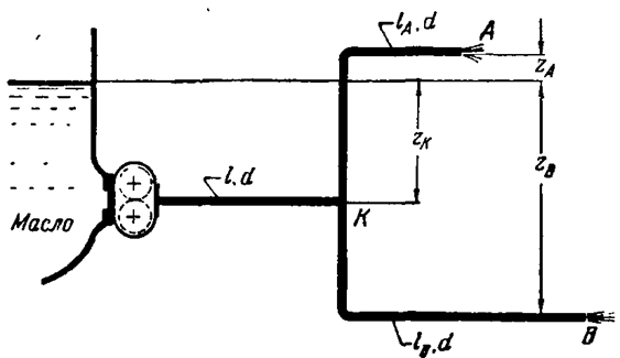 Шестеренный насос подает масло (плотность р = 900 кг/м3; вязкость v = 0,76 Ст) в количестве Qн = 0,8 л/с из маслосборника в пункты А и В. Давление воздуха над свободной поверхностью масла и на выходе из труб - атмосферное. Длины и диаметр маслопроводных труб, выполненных из латуни, равны: l = 1 м; lA = 1,5 м; lв = 2,4 м; d = 10 мм. Вертикальные расстояния точек A, В и К (узловая почка) от свободной поверхности равны: zA = 0,2 м; zB = 1,3 м; zK = 0,4 м.