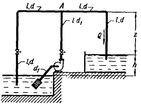 Центробежный насос перекачивает воду по трубопроводу (l = 5 м, d1 = 75 мм), который в узле А разветвляется на две линии диаметром d = 50 мм и длиной 2*l каждая. Расход в правой ветви Q = 10 л/с, а высоты равны h = 1 м, z = 4м. Определить мощность насоса Nи, принимая коэффициент сопротивления трения в трубах λ = 0,03, суммарный коэффициент сопротивления всасывающей линии ξВС = 10 и пренебрегая потерями и задвижках. Указать сечение трубопровода, в котором имеет места наименьшее давление.