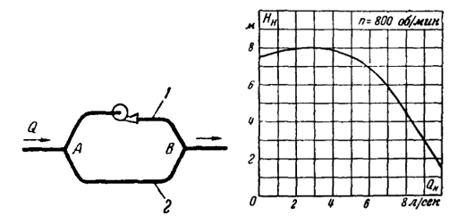 2 Найти частоту вращения насоса, при которой весь суммарный расход Q = 12 л/сек будет поступать в трубу 1 и расход в трубе 2 будет равен нулю. В трубах между узлами А и В учитывать только потери на трение по длине (λ = 0,03).