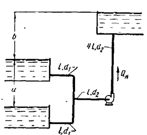 Центробежный насос всасывает воду из двух баков, разность уровней в которых a = 1 м, и нагнетает ее в количестве Qн = 10 л/с в бак с уровнем на высоте b = 5 м по указанным на схеме трубопроводам (l = 5 м, d1 = 50 мм, d2 = 75 мм).