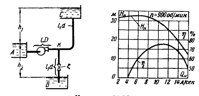 Центробежный насос подает воду из бака А по трубе l=50 м и D = 70 мм к точке K разветвления трубопроводов, откуда вода по трубам одинаковой длины l=20 м и одинакового диаметра d = 50 мм поступает в баки В и С. На трубе, идущей в бак В, имеется задвижка, коэффициент сопротивления которой (при неполном открытии) = 30. Уровень в баке С -выше уровни в баке А на h1= 16 м, а в баке В ниже того же уровня на hа=10 м. Определить: 1) Подачу в баки и потребляемую насосом мощность двигателя при n = 900 об/мин. 2) Как нужно изменить число оборотов, чтобы подача и баки стала одинаковой? 3) При каком числе оборотов подача в бак С будет равна нулю? При решении задачи учитывать сопротивление задвижки и потери на трение ( = 0,025).