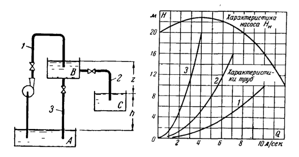 Центробежный насос перекачивает воду из бака А по трубе 1 в промежуточный бак В, откуда она самотеком поступает в бак С по трубе 2 и частично возвращается в бак А по сливной трубе 3. Характеристики насоса и труб заданы (см. график).
