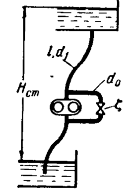 Диаметр основного трубопровода d1 = 50 мм, его приведенная длина l = 50м (λ = 0,025). Диаметр обводной трубы d0 = 32 мм, ее суммарный коэффициент сопротивления (включая частично прикрытый вентиль) ξ = 33.