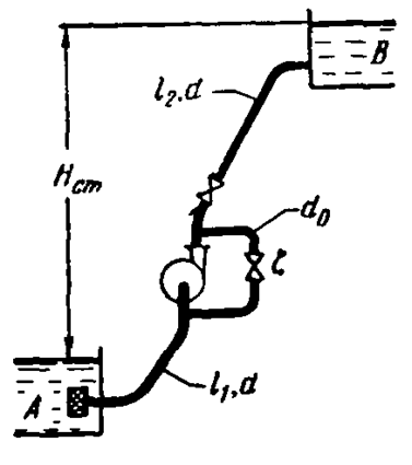 Центробежный насос, подающий воду из бака А в бак В на высоту Hст = 30 м, снабжен обводной трубой, по которой часть его подачи возвращается на сторону всасывания. Диаметр всасывающей и нагнетательной труб d = 100 мм, их общая приведенная длина L = l1 + l2 = 250 м, коэффициент сопротивления трения λ = 0,025. Диаметр обводной трубы d0 = 50 мм, ее суммарный коэффициент сопротивления ξ = 25.